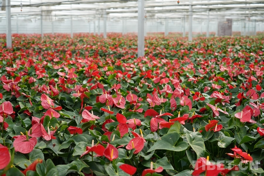 The seeds of national unity sowed by Princess Wencheng still blossom in vibrant hues today. The total investment for the Caina Zone amounts to RMB 600 million, which includes a contribution of RMB 150 million from Jiangsu Province aimed at supporting Xizang. The Anthurium Andraeanum Linden Flower Base serves as an exemplary model of industrial assistance to Xizang, facilitated by Taizhou, Jiangsu Province. This base was collaboratively established by Suzhong Horticultural Company, a state-owned enterprise based in Taizhou, and the Caina Zone. Covering a total area of 16 mu, the greenhouse spans over 10,000 square meters and can produce 100,000 pots of fresh flowers annually.